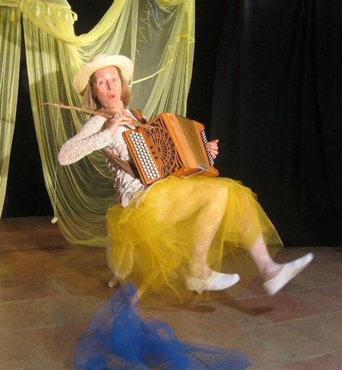 Avec grâce, elle nous régale de chansons à l'accordéon, de petits pas de danse, de poèmes au goût de fraise.