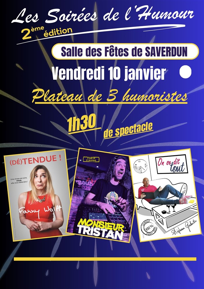 3 humoristes se partagent la scène durant1h30. Fanny Wolf, Mr Tristan & Stéphane Galentin vous font découvrir 30 minutes de leur univers respectif. L'association "Les Planches Vernetoises" a la volonté de faire venir dans nos communes, des spectacles de théâtre et d'humour interprétés par des comédiens confirmés et professionnels. Mais à aussi la volonté de les rendre accessibles à tout le monde.