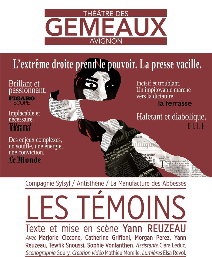Un président d’extrême droite est élu et les journalistes du grand quotidien Les Témoins se retrouvent confrontés à la dure réalité : comment conserver leur éthique et continuer d'informer ; leur mantra, "des faits et non des opinions” ? Malgré les divergences idéologiques, les aléas personnels, faire front face aux attaques du nouveau pouvoir dont ils deviennent la cible. Excellent spectacle, très bien écrit et brillamment mis en scène par Yann Reuzeau. Ainsi la salle de presse, centre de l’action et le plateau divisé par l'éclairage judicieux pour les événements extérieurs, le décor qui se brise symboliquement. Quant à la distribution de grande qualité, elle repose beaucoup sur la maestria des rôles féminins : Sophie Vonlanthen, rédactrice en chef implacable et pourtant empreinte d’une rare humanité ; Catherine Griffoni la "bourgeoise” Clara Leduc la rebelle. Les comédiens eux aussi endossent plusieurs rôles avec talent. Pas de temps morts, suspens assuré. Je n’ai pas vu ces deux heures passer ! La presse, dernier rempart de la démocratie, aspect le plus passionnant de cette pièce assurément salutaire !