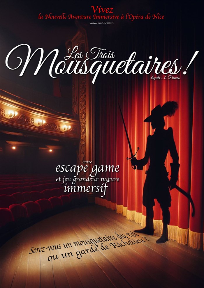 Plongez dans l'année 1628, lors du grand bal du Roi Louis XIII, à travers une expérience immersive où chaque choix détermine le cours de votre aventure. Situé dans le cadre majestueux de l'Opéra de Nice, ce spectacle d'Art Game allie escape game, théâtre interactif, et jeu avec un mélange captivant d'énigmes, de missions secrètes et d'interactions avec des personnages tirés de l'oeuvre d'Alexandre Dumas.
