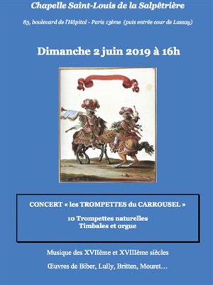 Les Trompettes du Carrousel vous proposent un concert d'oeuvres de Biber, Lully, Britten, Matry, Philidor, avec trompettes, timbales et orgue.