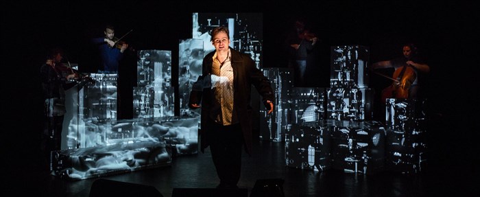 Sur un plateau sans cesse métamorphosé par des projections vidéo signées Dirty Monitor, la musique électronique rencontre la puissance d'un quatuor à cordes, le tout formant l'écrin du récitant, juché sur une ville miniature et protéiforme.