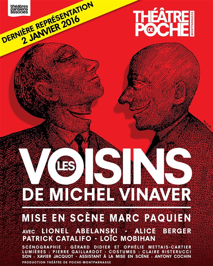 Ce huis clos en extérieur, dans l'intimité du Poche, nous emmène dans des rapports de voisinage qui semblent simples et profonds, et qui vont évoluer pour prendre de sacrés virages. Profonds, ils le restent. Pour le reste, nous allons de rebondissement en rebondissement, avec une fin plutôt surprenante et déstabilisante. La distribution est de très belle facture, Patrick Catalifo et Lionel Abelanski sont plein de puissance et de nuances. Alice Berger s'avère prometteuse. Michel Vinaver, quant à lui, ne déçoit jamais.