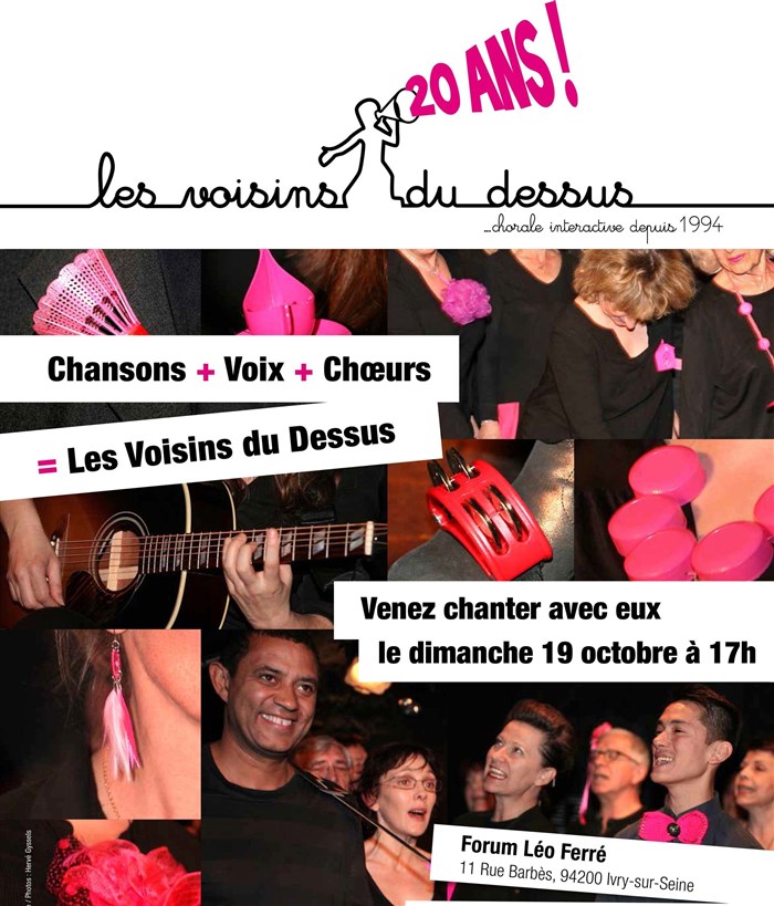 "A l'occasion de ses 20 ans d'existence, le groupe vocal Les Voisins du dessus a décidé de célébrer cet anniversaire de la façon la plus logique qui soit ... avec vous et en chansons !