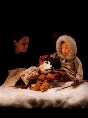 Des marionnettes, des animaux de papier (l'ours est superbe!), une mer impressionnante, des ombres chinoises, les décors sont très évocateurs et très poétiques, trois comédiennes marionnettistes les manipulent à vue tandis que la sonorisation finit de nous immerger au pôle nord. La variété des propositions visuelles tient les petits très attentifs!