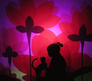Une conteuse accompagne cette histoire en musique tandis que l'on devine la silhouette de deux acteurs interprétant les personnages derrière un écran.