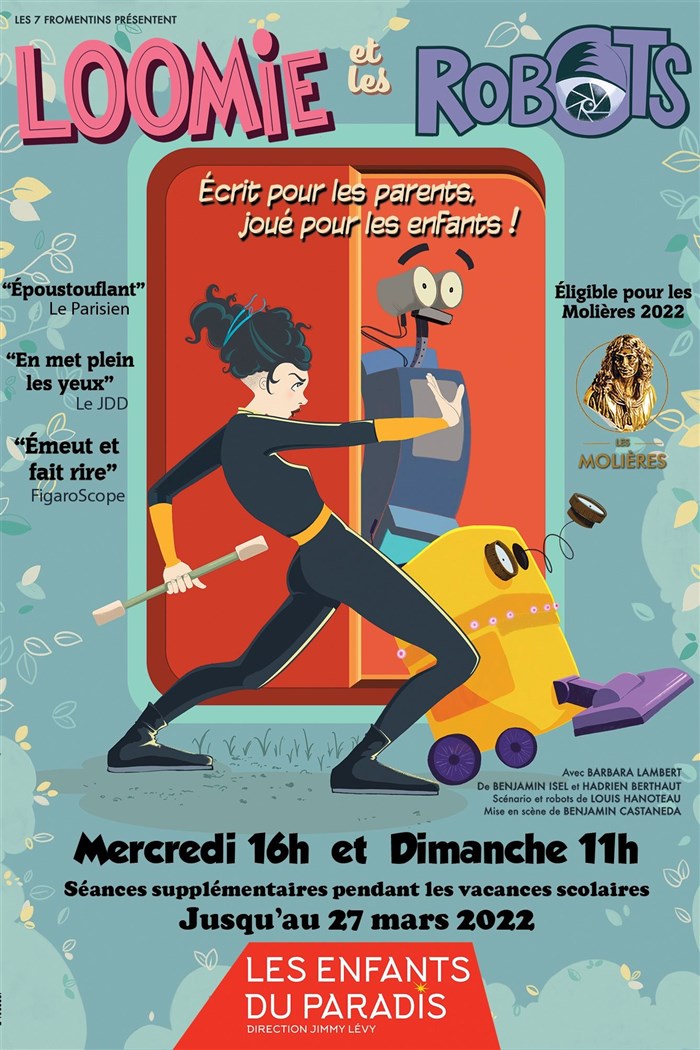 Eligible aux Molières 2022, "Loomie et les robots" est un spectacle familial qui met en scène 7 personnages dont une seule comédienne. Elle est accompagnée de véritables robots créés et contrôlés par Louis Hanoteau.