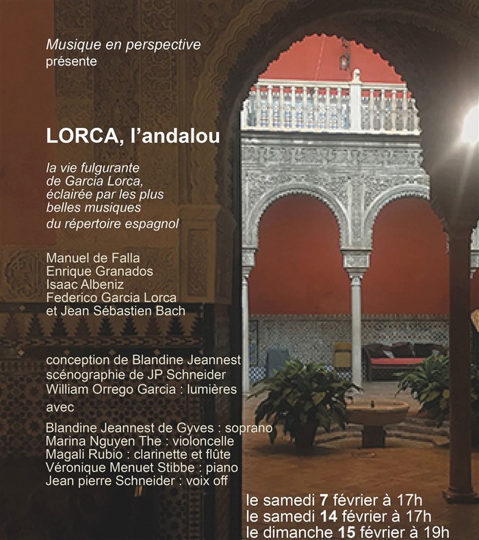Pour Blandine Jeannest qui poursuit avec les musiciens de Musique en perspective son travail de mise en relation de la poésie et de la musique a voulu mieux comprendre après un voyage en Andalousie l 'âme de cette terre de passion ; La poésie de Garcia Lorca, sa douceur et sa violence traduisent et permettent de mieux comprendre cette terre de contraste et de civilisation, d'orient et d'occident, de religion et d'athéisme.
