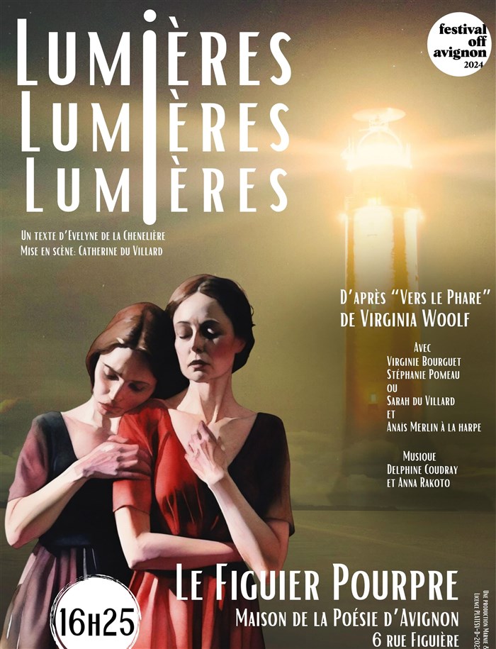 Adapté du roman "Vers le Phare" de Virginia Woolf (Prix Femina 1928), "Lumières, Lumières, Lumières" de l'écrivaine québécoise Evelyne de la Chenelière reprend toute la psychologie et la richesse de l'écriture de Virginia Woolf. Le texte est le cheminement en parallèle de deux réflexions, l'être et le paraître, au travers de morceaux de vie doux-amers comme un écho à notre propre existence. La mise en scène mêle théâtre et musique originale, avec la présence d'une harpiste au plateau qui accompagne les voix des comédiennes comme un souffle, une respiration.