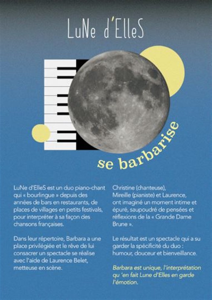 Lune d'Elles, duo piano-chant, interprète Barbara. Ce spectacle est un concert intime et épuré, saupoudré de pensées de la Grande Dame Brune.