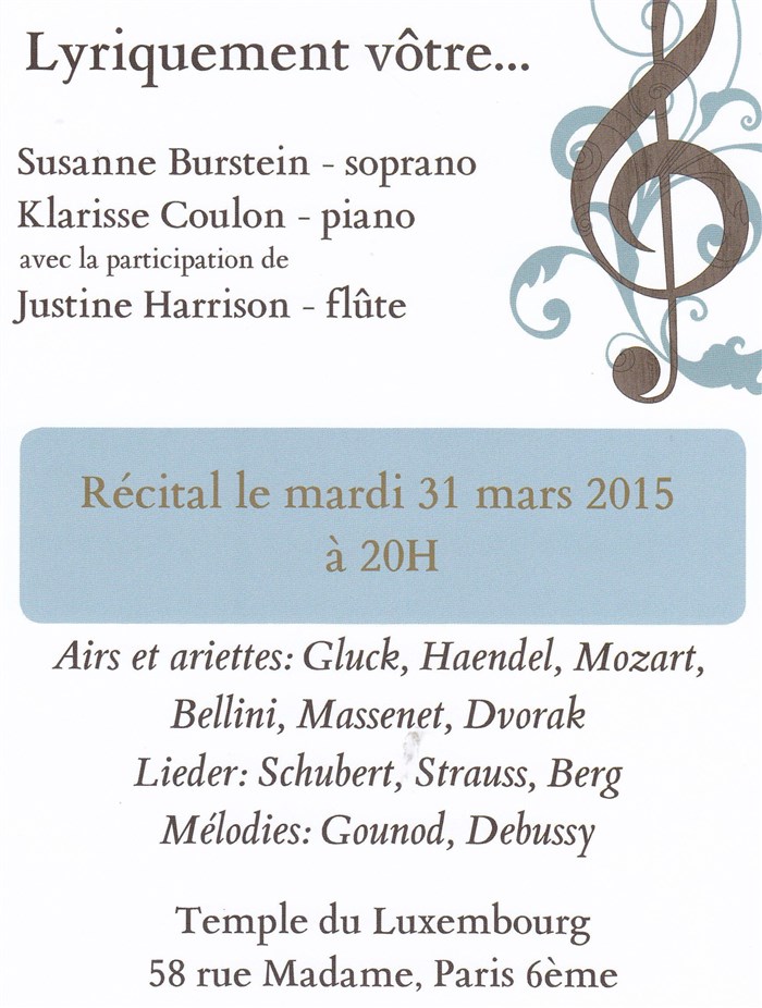 Récital avec Susanne Burstein, soprano et Klarisse Coulon, piano et la participation de Justine Harrison, flûte. Airs et ariettes de Gluck, Haendel, Mozart, Bellini, Massenet, Dvorak. Mélodies de Gounod et Debussy. Lieder de Schubert, Strauss et Berg.
