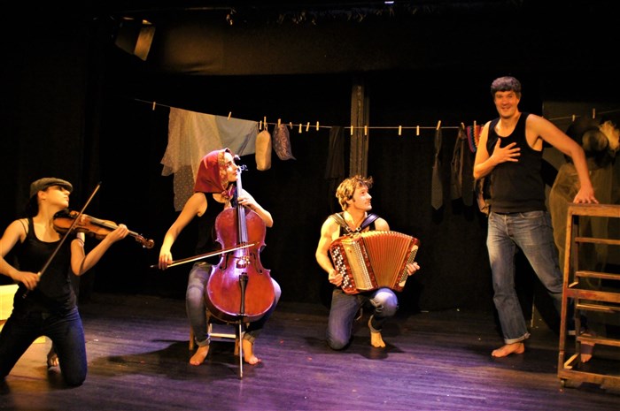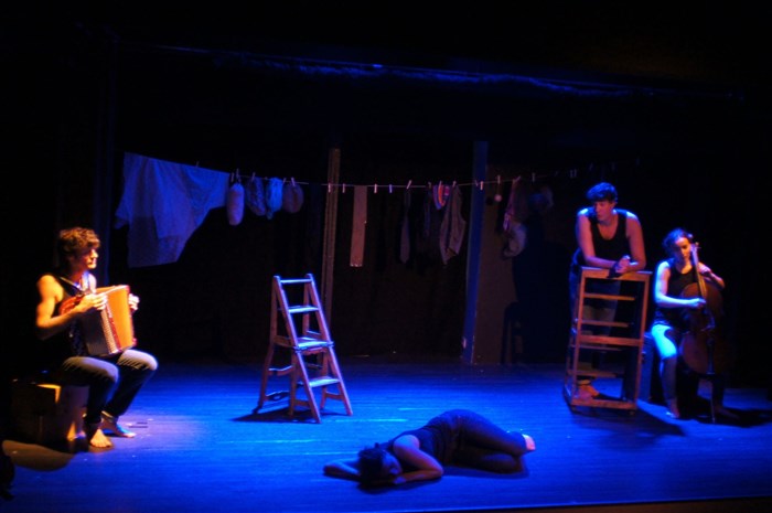 Quatre comédiens-musiciens, leurs instruments (violon, violoncelle, accordéon) et leurs chansons (yiddish, tziganes, catalanes, russes... ), donnent vie à l'ironie, la violence et la tendresse qui parcourent ce texte, dont l'adresse directe au public, entre récit et représentation, fait entrer le spectateur dans un monde où la folie n'est jamais très loin...
