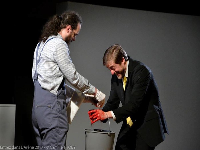 Cette réécriture de Shakespeare est réalisée avec finesse et précision. Le texte contient des phrases poétiques et de belles trouvailles dans une langue ciselée. L'intrigue de la pièce originale est resserrée et l'auteur ne garde que les personnages essentiels. Leur rôle dans le monde contemporain est habilement trouvé : PDG, collègues, techniciens de surface remplacent la haute société du seizième siècle. Les acteurs s'emparent de ce texte avec toute leur énergie et jouent avec une grande complicité. Cette complicité rend le spectacle fluide et les scènes s'enchaînent naturellement — sauf un ou deux noirs, nécessaires, entre certaines scènes. Le jeu est précis et propre, mais les acteurs s'amusent et évitent ainsi de produire un jeu figé. Donc si jamais la vue d'une tragédie de Shakespeare vous effraie, sachez qu'on rit ! À voir donc pour entendre le texte d'un jeune auteur et metteur en scène prometteur, débattre de l'état du monde et de la valeur du travail aujourd'hui, ou encore porter un regard neuf sur un texte classique.
