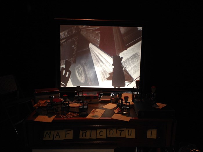 Dans le bureau de grand-père, également salle du trône du Roi, deux petites-filles devenues grandes font revivre avec plaisir et poésie leurs souvenirs d'enfance et le pays de Maféricotupi. Les deux femmes sont à la fois deux soeurs et des personnages du pays inventé par grand-père. Elles sont la princesse et la colporteuse de ce pays et prennent prétexte des objets du bureau pour ouvrir les portes de l'imaginaire.