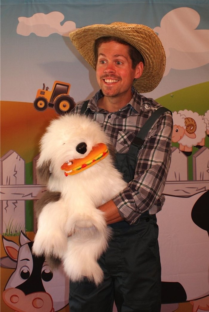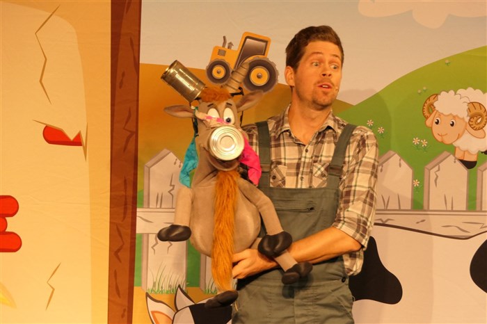 Sur scène : un comédien-magicien, des animaux rigolos (marionnettes de ventriloquie) et le décor de la Ferme.