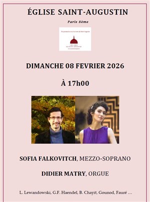 Sofia Falkovitch, mezzo-soprano et Didier Matry, orgue vous proposent des oeuvres de L. Lewandowski, G.F. Haendel, B. Chayit, Gounod, Fauré...