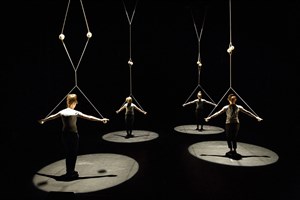 Des balles blanches flottent toutes seules dans le noir, les cannes se ploient et dessinent un univers d'herbes folles, une étonnante géométrie naît de la manipulation des fils et des balles, que révèle la lumière et la vitesse. Exploration cinétique et magie sans trucage en trois tableaux, cette pièce est inspirée de Hic, pièce emblématique de la Compagnie Jérôme Thomas.