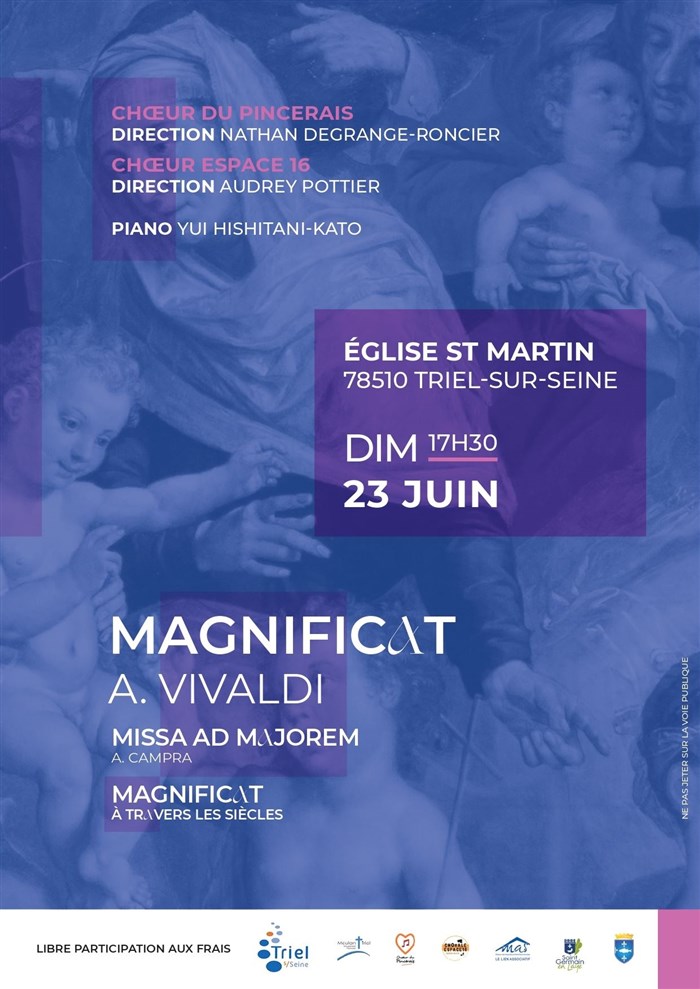 Les choeurs du Pincerais, dirigés par Nathan Degrange-Roncier et Espace 16, dirigé par Audrey Pottier, sont heureux de vous retrouver et de vous proposer un moment musical avec le Magnificat de Vivaldi et d'autres pièces (Missa Ad Majorem d'André Campra, extraits de Magnificat).