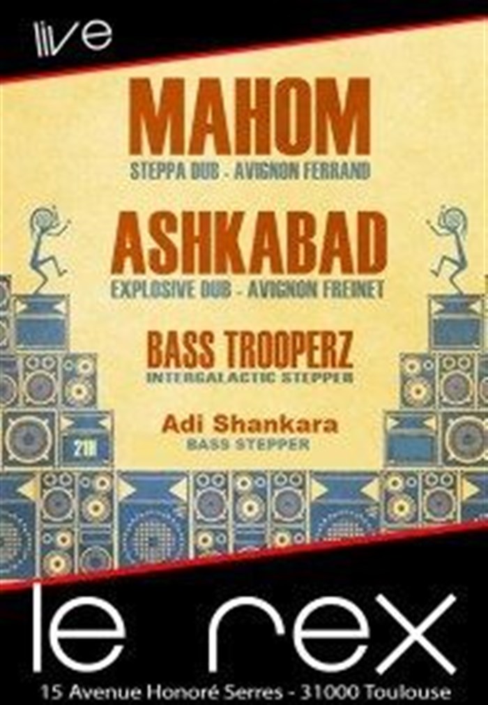 Pour sa première soirée dub, le Rex vous propose de vibrer avec Adi Shankara, Ashkabad, Mahom et Bass Trooperz.Venez vivre le voyage intersidéral.