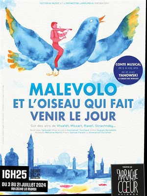 Malevolo nous embarque immédiatement dans son univers. Spectacle très poétique et très bien interprété, avec un violoniste et un pianiste qui accompagnent tout le long du spectacle de manière très talentueuse. Sans oublier la présence d'une accrobate qui arrive pour merveilleusement bien complèter le panel des artistes ! Bravo !
