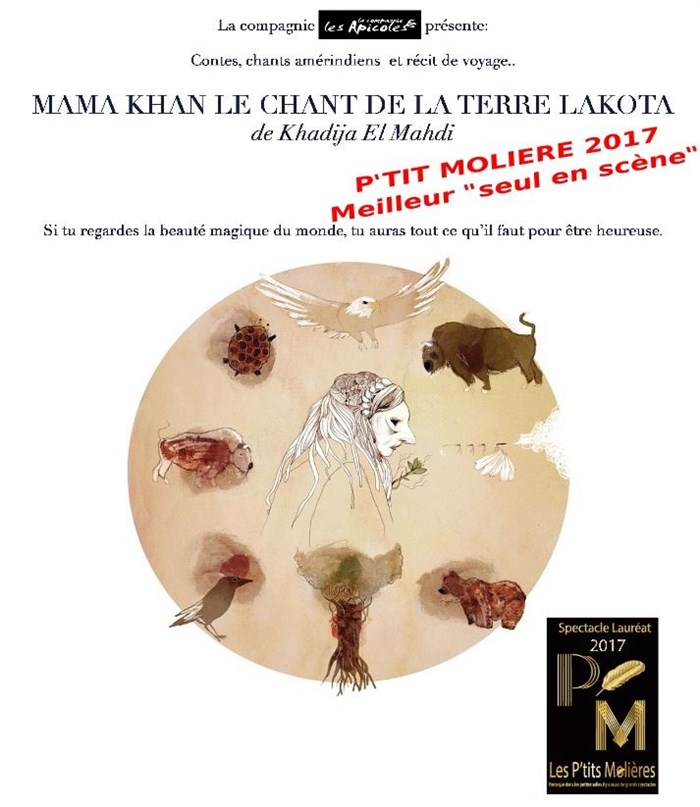 En quête des trésors des civilisations anciennes, qui vénèrent la nature par les danses et les tambours, Mama Khan s'est rendue auprès des grands-mères Lakota de la réserve de Pine Ridge, dans le Dakota du Sud. A travers leurs contes et leurs chants, elle révèle les coutumes anciennes de ce peuple autochtone, célébrant ainsi sa spiritualité et son rapport à la nature. Premier opus d'un projet en 13 créations (Les 13 chemins de Grand-Mère Terre), ce spectacle allie le masque, le conte et les mythes des cultures premières. Treize années pour rencontrer treize civilisations et créer treize personnages masqués de grands-mères. Chacune d'entre elles est porteuse du patrimoine matrilinéaire immatériel d'un peuple premier...