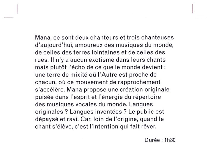 Mana propose une création originale puisée dans l'esprit et la vitalité de ce répertoire infini.