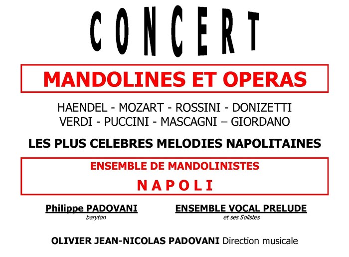 Accompagné par le groupe de mandolinistes NAPOLI, vous pourrez entendre les "tubes" de l'opéra italien (Traviata, Don Carlo, Cavalleria Rusticana, Don Giovanni, L'élixir d'amour...) chantés par l'ensemble vocal PRÉLUDE ainsi que par l'excellent baryton Philippe Padovani dont la voix puissante et profonde fait merveille dans ce répertoire de Bel Canto.