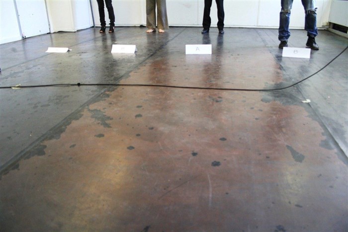 Deux micros sont plus près du public pour un plan de réalité, d'incarnation de fragments de texte de Sarah Kane par un cinquième interprète, de profil, sorte de commentateur ou écho des autres et interlocuteur des autres.