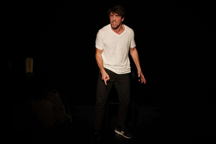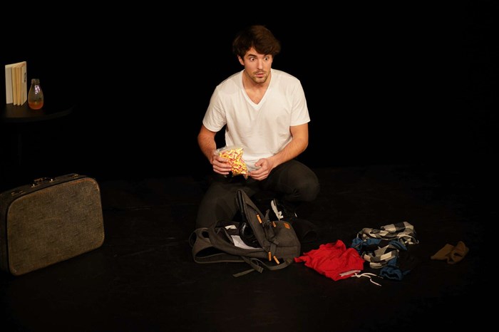 Note de mise en scène: "Un espace vide ou presque, une chaise, une table, une valise et une carte du monde. Des jeux de lumières permettant de créer des espaces imaginaires dans lesquels Marc interprète tour à tour les personnages de son spectacle".