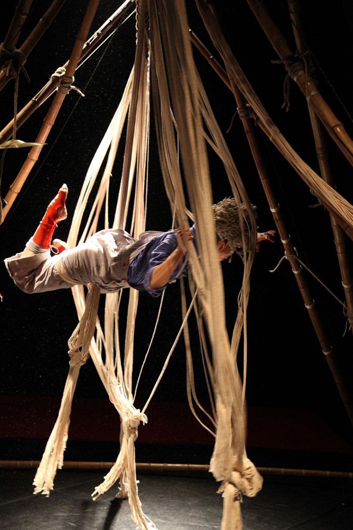 Conte circassien et musical de Sika Gblondoumé (conte, musique et contorsion), Cécile Mont-Reynaud (aériens, en alternance avec Camille Voitellier) et Catherine Dubois (dramaturgie et mise en scène)