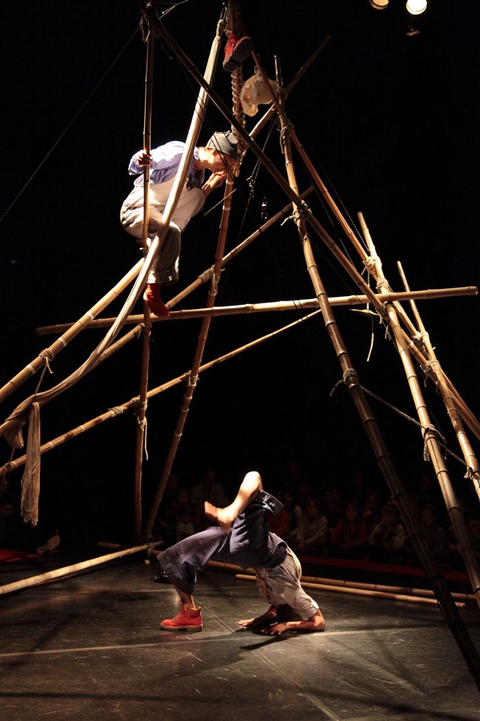 Mais en chemin il rencontra une terrible femme, laide, sotte et sale, qui lui fit peur... C'est ce conte contemporain dédié aux enfants de 3 à 7 ans qui est chanté, dansé et transfiguré par l'acrobatie aérienne autour d'une énigmatique structure en bambou, sous le grand chapiteau du Cirque électrique.