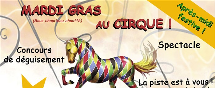 Avis à tous les enfants: Mardi Gras au Cirque! Spectacle de cirque complet, Concours de déguisement, La piste est à Vous, Goûter de Mardi Gras.