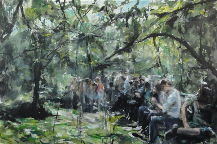 Saisie d'immobilisme, je regarde autour et n'y vois que du feu. Alors, je recherche, au travers des sujets les plus classiques et les plus quotidiens, avec toutes les ressources techniques de la peinture ou du dessin, des rapprochements saugrenus, des collisions d'idées, pour tenter de dire simplement la complexité de nos sentiments, de notre relation à la réalité.