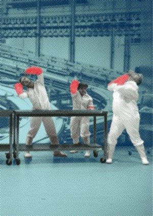 " Histoire de réduire les frais de production ", ceux-ci incarnent à la fois les employés d'une usine à viande, les machines et les gallinacés qu'ils décortiquent allègrement.