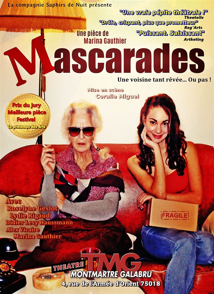 Pour cette pièce (l'amitié qui va rassembler deux personnages que tout oppose, un diner qui finit en jeu de massacre) la comédienne-auteure Marina Gauthier y ajoute une touche personnelle faite de sincérité et d'émotion qui donne à "Mascarades" au parler vrai son côté touchant et attrayant