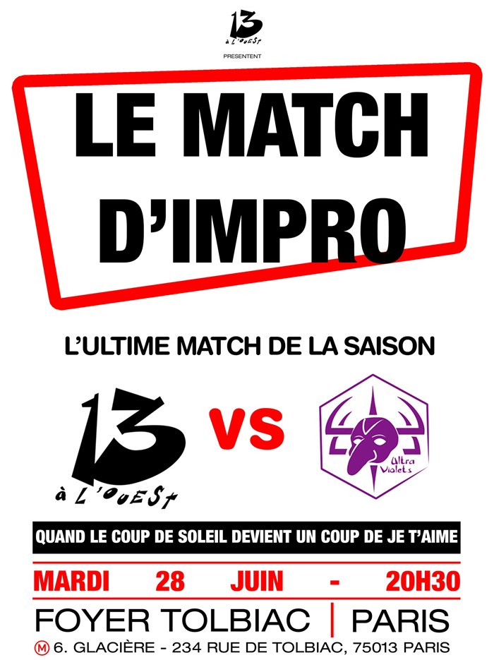 Connue pour ses événements conviviaux et de qualité, les 13 à l'Ouest convient les Ultraviolets au dernier match d'improvisation de la saison
