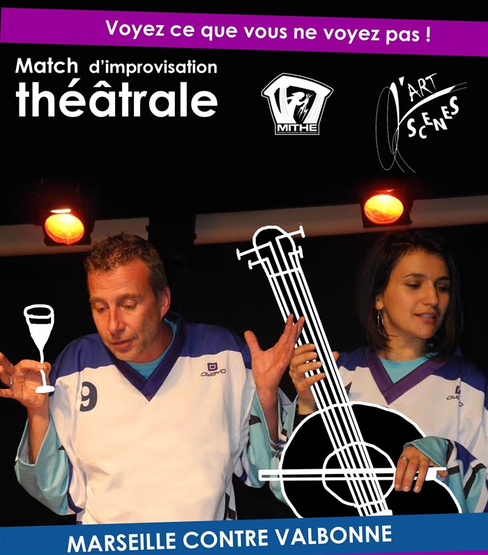 L'équipe l'Art-Scènes de Valbonne rencontre l'équipe du Mithe de Marseille pour un match d'improvisation qui promet d'être riche en personnages farfelus, en rebondissements de tout genre, en histoires palpitantes, pour vous emmener là où vous ne vous attendez pas, alors préparez-vous... à voir ce que vous ne voyez pas!