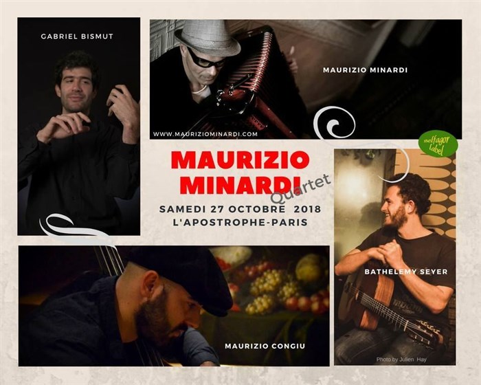 Le compositeur, pianiste et accordéoniste italien Maurizio Minardi a publié 13 albums, joué dans de nombreux festivals européens et obtenu de nombreux prix. Sa musique allie le jazz à la musique baroque, le tango à la musique contemporaine. À Paris depuis près de deux ans, après un séjour de près de 10 ans à Londres, Maurizio présente de nouveaux morceaux et arrangements avec son nouvel ensemble : Gabriel Bismut (Violon) Barthelemy Seyer (guitare) Maurizio Congiu (contrabasse) et Maurizio Minardi (accordéon).