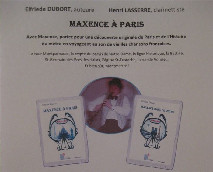 Courte présentation de la genèse des livres "Maxence dans le métro" et "Maxence à Paris", lecture d'extraits, passages mis en scène, effets de surprise et tout cela ponctué de vieilles chansons françaises jouées à la clarinette et certaines accompagnées par une guitariste.