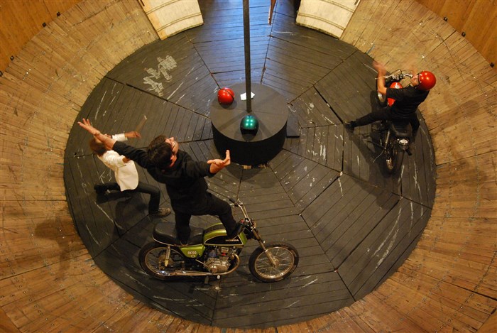 On assiste à des numéros spectaculaires défiant les lois de l'apesanteur. À l'intérieur, des motos gravitent sur la paroi verticale.
