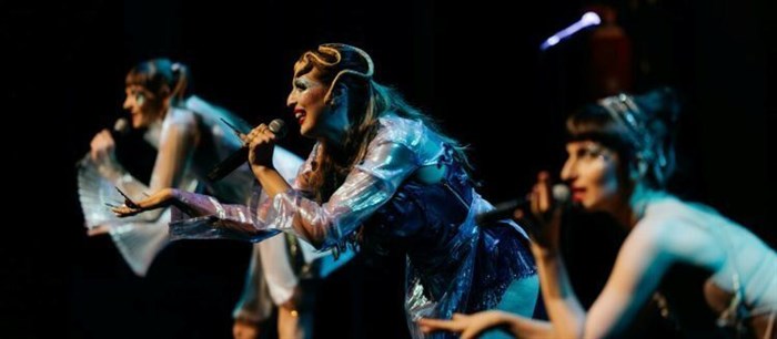 Médusa, créature mythique et cabarétique, enrage - serpents sifflants sur sa tête, morsures brillantes sur son corps, regard pétrifiant.