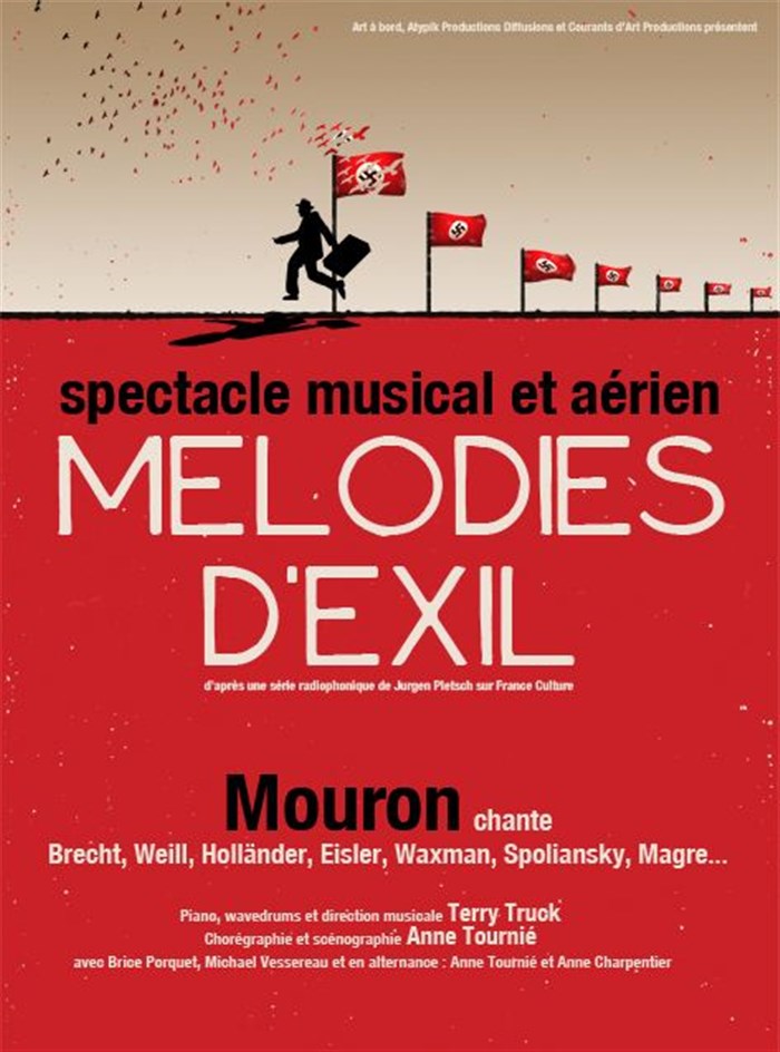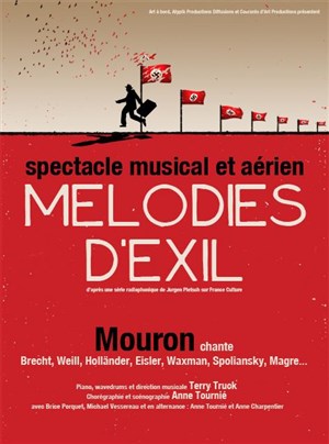 Spectacle musical, Mélodies d'exil mêle chanson et danse aérienne pour conter le destin d'une poignée d'artistes, compositeurs, peintres et intellectuels qui ont fui, durant l'entre-deux guerres, leur pays natal, devenu l'Allemagne nazie.