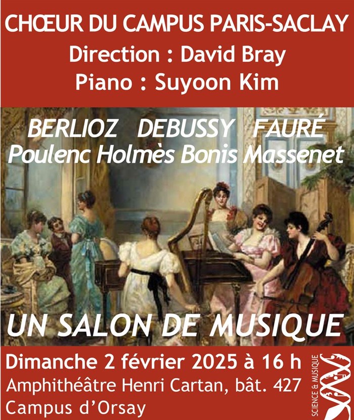 Le Choeur du Campus Paris-Saclay interprétera un florilège de mélodies françaises, rencontre entre les poèmes de Racine, Hugo, Verlaine et bien d'autres avec la musique écrite par les plus célèbres compositeurs et compositrices de cette période : Berlioz, Gounod, Saint-Saëns, Massenet, Fauré, Holmès, Bonis, Debussy, Canteloube, Poulenc.