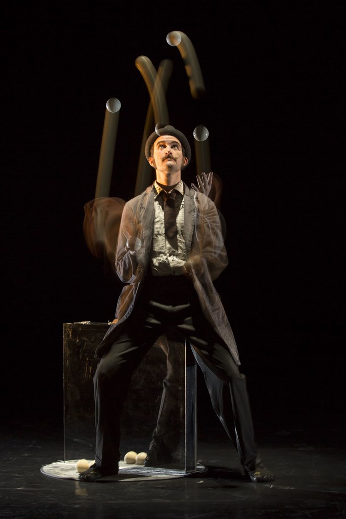Dans Membre Fantôme, seul face au(x) miroir(s), Nicolas Longuechaud développe sa réflexion en un travail de jonglerie sensible, mise en tension à l'aide de petites balles blanches, aux marges de la jonglerie et de l'illusion d'optique.