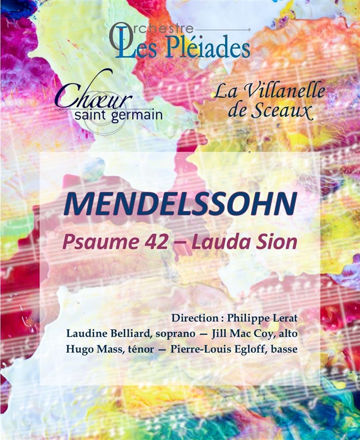 Le Psaume 42 – "le sommet inégalé de toute la musique sacrée de Mendelssohn" dira Schumann – et le Lauda Sion sont deux oeuvres majeures dans la production du compositeur, écrites pour choeur, solistes vocaux et orchestre. Rassemblant près de 200 interprètes, trois formations se sont associées pour ce programme exceptionnel: le Choeur St Germain de St-Germain-en-Laye, le choeur La Villanelle de Sceaux et l'Orchestre Les Pléiades ainsi qu'un quatuor de solistes: Laudine Belliard, soprano; Jill McCoy, alto; Hugo Macé, ténor; Pierre-Louis Egloff: basse.