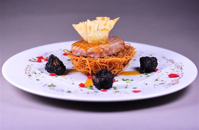 Pour suivre, vous apprécierez le "volte-face de saumon à la mode de Shanghai servi sur un lit de nouilles croquantes". Un plat tout en contraste, tant en terme de goût que de textures.