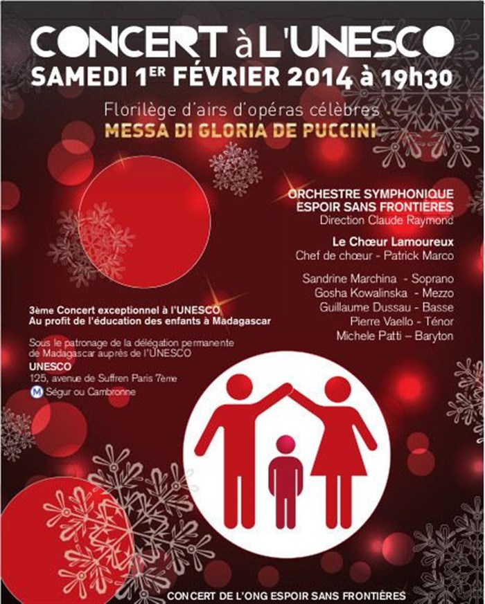L'orchestre symphonique Espoir sans Frontières et les choeurs Lamoureux interpréteront la Messa di Gloria de Puccini et un florilège d'airs d'opéra sous la direction de Claude Raymond.