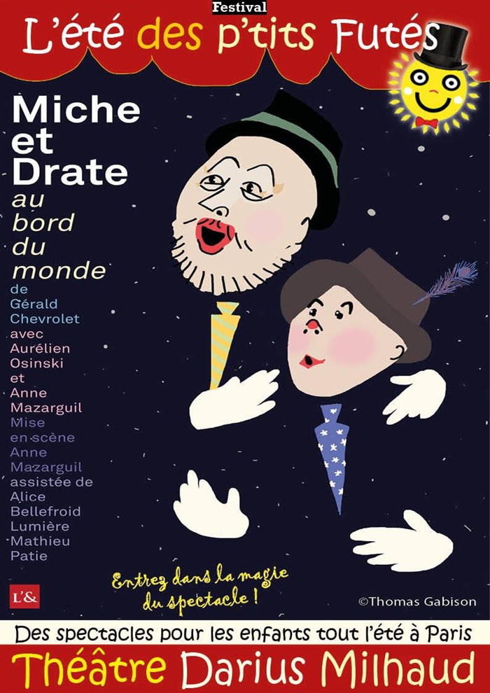 " Miche et Drate - au bord du monde " vous est présenté dans le cadre du festival parisien de spectacles jeune public " L'été des p'tits futés " organisé par le Théâtre Darius Milhaud situé à deux pas des Parcs de la Villette et des Buttes-Chaumont. Entrez dans la magie du spectacle !