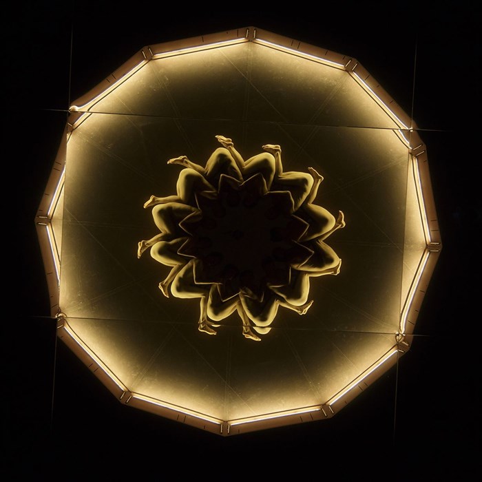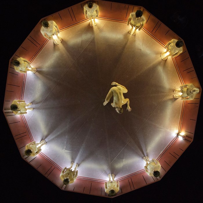 Il peut aussi se coucher à même le sol pour découvrir la fresque vivante grâce au miroir géant placé au-dessus des danseurs. Leurs corps sont dévêtus afin que la chair soit mise en valeur et sublimée. Se définissant comme un acte esthétique aux accents baroques, cette mise à nu interroge notre ressenti face aux corps exposés, en projetant une vision où beauté et trivialité se fondent dans une harmonie complémentaire.