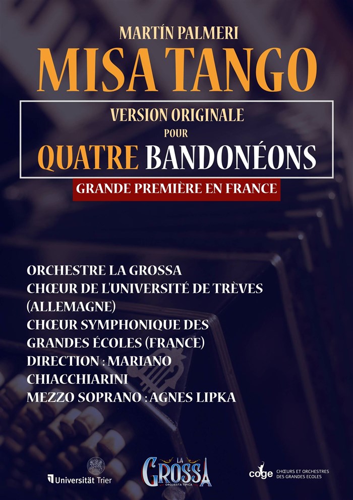 L'orchestre La Grossa, le Choeur de l'Université de Trèves (Allemagne) et le Choeur symphonique des Grandes écoles (France) vous proposent un concert exceptionnel autour de la MisaTango de Martin Palmeri qui sera jouée pour la première fois en Europe dans sa version originale, composée pour quatre bandonéons.